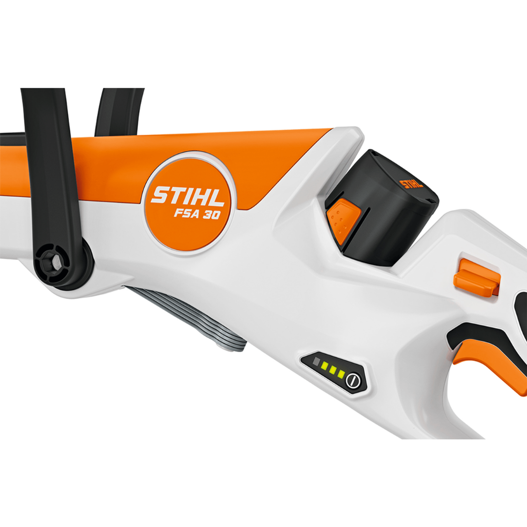 A FSA 30 vem equipada com a cabeça de corte PolyCut 3-2, que utiliza duas lâminas plásticas móveis e resistentes, com espaço para armazenar até seis lâminas sob a tampa da ferramenta. Como acessório opcional, também é compatível com a cabeça de corte AutoCut C 3-2, que utiliza fio de nylon de 1,4 mm. Com 2,1 kg sem conjunto de corte e proteção, é extremamente leve e fácil de manusear. A operação é silenciosa e livre de emissões, tornando-a perfeita para uso em áreas urbanas e residenciais.